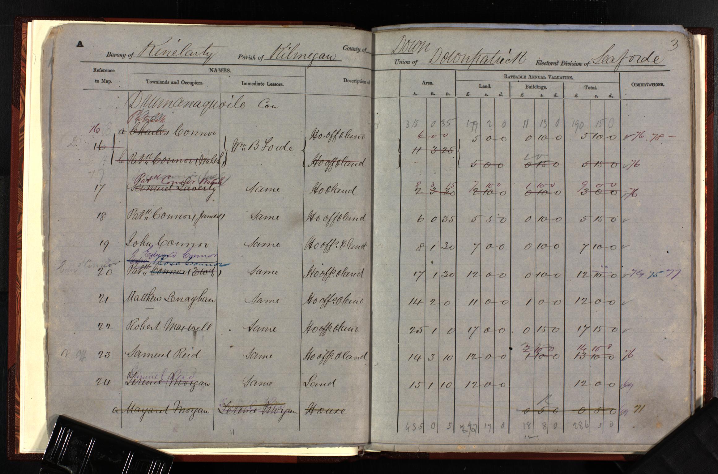https://apps.proni.gov.uk/DCAL_PRONI_Val12b/Large%20JPeg/IRELBEL1D_032/IRELBEL1D_VAL12B-18-24A/IRELBEL1D_VAL12B-18-24A_M_00003.jpgIf change the final digit get previous page with John Connor junior on at map ref 15. The fact that 16 says Pat Connor (Walsh) and 17 Pat Connor (James) is to distinguish them. Also have Pat Connor (Ewd) at 20, who perhaps died 1873 & had a wife Rose and son Edward [named after his grandfather]. Have to turn to Civil deaths to confirm (not all deaths were registered and some changes are due to emigrations). People can have parcels of land in adjoining townlands sometimes one has the house + land and the other just land.