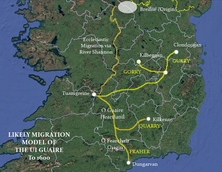 It seems several branches of the family took on "Mac" or "Mac Ui" Guaire. There were several Ua Guaire abbots of Tuamgreine who are likely our people. The location of Tuamgreine across Lough Derg fits the most likely migration model of this family, and would also explain the population density of the name in W. Tipperary 1667 Hearth Rolls where all of the variants O'Gowry, M'Ghoory, Quary, Cowry, M'Gora, M'Gorigh, Goory, Gurrey, Corey, appear in a cluster very close to the "O'Fearchair" heartland of Templeneiry, which would explain the Fraher surname among us. It's more than likely that as O'Fearchair is a young surname, that there may have been a Fearchair O'Guaire in the 14th or 15th centuries that spawned a new surname which is distictly S. Tipperary/Waterford.