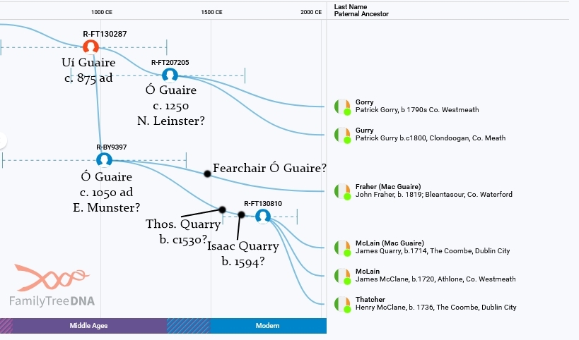 I would very much like to connect the Waterford Quarry family to the rest of us and not only see where they fall on our tree, which would put more puzzle-pieces together of this larger family. If any of you have Quarry relatives from the area who would be interested, you can reply to this post or sent me a private message. Also, although I'm not specifically looking for Gorry/Gurry/Gorey participants as it pertains to my own specific line, all of these variants would be kin to the greater MacGuaire family. If any Goreys are interested in joining the group and getting started with Y-DNA research, please contact me as well, I'll tell you how to get started and I'd love to have you aboard.