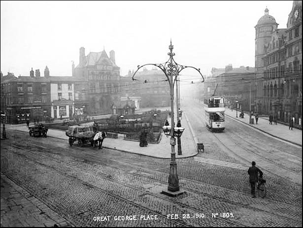 Great George Place was a triangle that included the David Lewis Hostel, where the tram is. It went behind the viewer to the junction of Parliament Street and Upper Parliament Street. It was numbered sequentially starting with No1 - the second building on the left - next to the Bermingham cocoa-room.